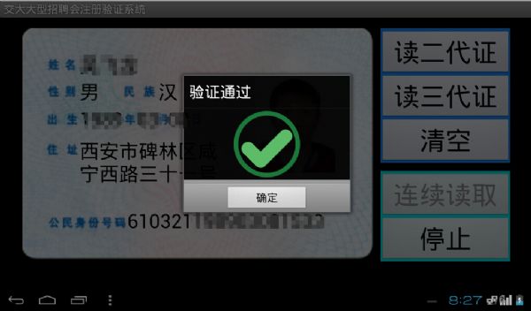 网络中心长期坚持“两个服务”,努力为学校的教学科研管理等基本业务活动提供信息技术支持。2014年底,在深入了解就业中心组织招聘会过程中需要解决的管理问题后,遵循强化流程、强化管理、强化服务的思路,积极主动与就业中心领导和业务人员研究、探索解决问题的方案,确定了采用外校学生提前网站注册,现场刷身份证验证取票的方案,不再进行收费,大大加快了外校学生领票入场的速率。为实现此方案,网络中心开发了基于第二代身份证读取的大型招聘会注册信息验证系统,此系统利用我国现行的二代身份证作为认证载体,应用移动智能终端作为识别、管理手段,具有良好交互性用户操作界面,极大方便了招聘会现场管理人员的组织秩序工作,极大方面了全省各高校毕业生进入招聘现场,也为学校就业中心事后的统计分析等管理工作提供了重要的依据。