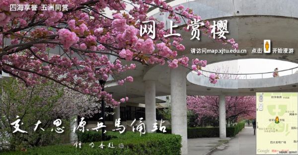 为了满足广大校友及校外人士对赏樱的热情,交大地图校园实景功能特推出了“网上赏樱”的特殊实景漫游路线。游客可以打开校园地图(http://map.xjtu.edu.cn),点击“网上赏樱”按钮,就可以欣赏最新的樱花全景图片,还可以点击樱花图片上的箭头前进至下一个景点进行观赏。樱花全景图片遍布东西樱花道与图书馆周围,各色樱花收录完整,白色、红色、绿色樱花竞相怒放,欢迎欣赏。