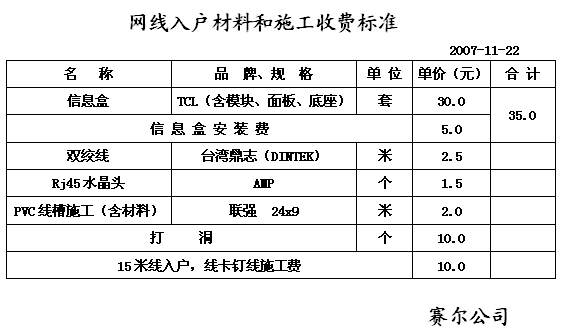 3.用户交纳的300元施工费中含15米入户网线和两个RJ45水晶头,由施工公司提供。